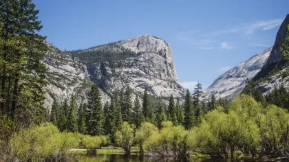 Viniendo desde el este, Yosemite se despliega con su belleza de tierras altas, una tierra de riscos de granito y prados alpinos, de los cuales los más conocidos son los de Tuolumne Meadows, con su paisaje interminable de senderos bien marcados. Desde sus tranquilos bordes, las rutas de senderismo conducen hacia distintas direcciones: hacia los lagos alpinos debajo de Cathedral y Unicorn Peaks y a una serie de cascadas descomunales en el río Tuolumne. El pequeño centro para visitantes, ubicado en una histórica cabaña, tiene exhibiciones que se centran en la geología, la flora silvestre y la vida salvaje de la región. Si continúas hacia el oeste llegarás al sitio emblemático del parque, el Valle Yosemite, donde hay autobuses que pueden llevarte a todos los puntos clave.
