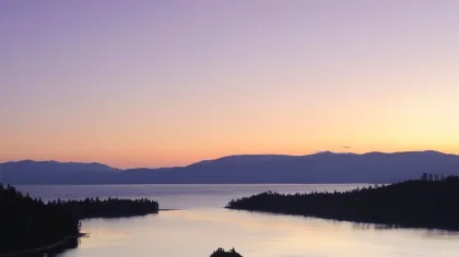 Mira hacia abajo hacia la asombrosa Emerald Bay y podrás ver por qué Mark Twain llamó a Lake Tahoe "la imagen más bella que ofrece toda la tierra". Mientras que el lago principal es tan azul como el topacio, un color creado por la notable transparencia y profundidad de Tahoe, esta bahía algo menos profunda en la costa oeste del lago adquiere un sorprendente y hermoso azul verdoso, que se hace aún más asombroso por el punto perfecto de la pequeña isla Fannette, el único islote en Lake Tahoe, justo en el medio de la bahía. Sal de la Carretera 89 y estaciónate cerca de Inspiration Point para obtener una de las mejores vistas de la ensenada, a 183 metros de Lake Tahoe. Intenta encontrar las ruinas de una pequeña casa de té de piedra encaramada en la cima de la isla. La casa de té y el castillo de piedra de estilo escandinavo de 38 habitaciones conocido como Vikingsholm, que se encuentra en la costa cercana, fueron construidos por Lora Knight, una mujer extraordinaria que obtuvo una enorme riqueza al casarse, y que luego usó su dinero para educar a jóvenes sin recursos. Aprende sobre ella y recorre su casa ricamente detallada y construida a mano, una réplica de un castillo escandinavo del siglo IX, en recorridos que se ofrecen durante todo el verano. Definitivamente vale la pena hacer la caminata desde el estacionamiento.